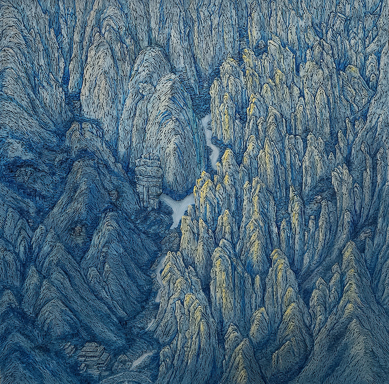 My recent works are created from a bird’s-eye perspective, depicting the landscape of the “Baekdudaegan,” the great mountain spine that forms the main artery of Korea’s mountain ranges. Each mountain possesses its own unique beauty, yet when they gather together, they reveal certain repetitive forms and structural patterns, allowing us to perceive underlying principles. Based on the ridgelines that serve as watersheds, countless streams branch out and flow downward, and within these basins, ecosystems—including human life—are formed and sustained.