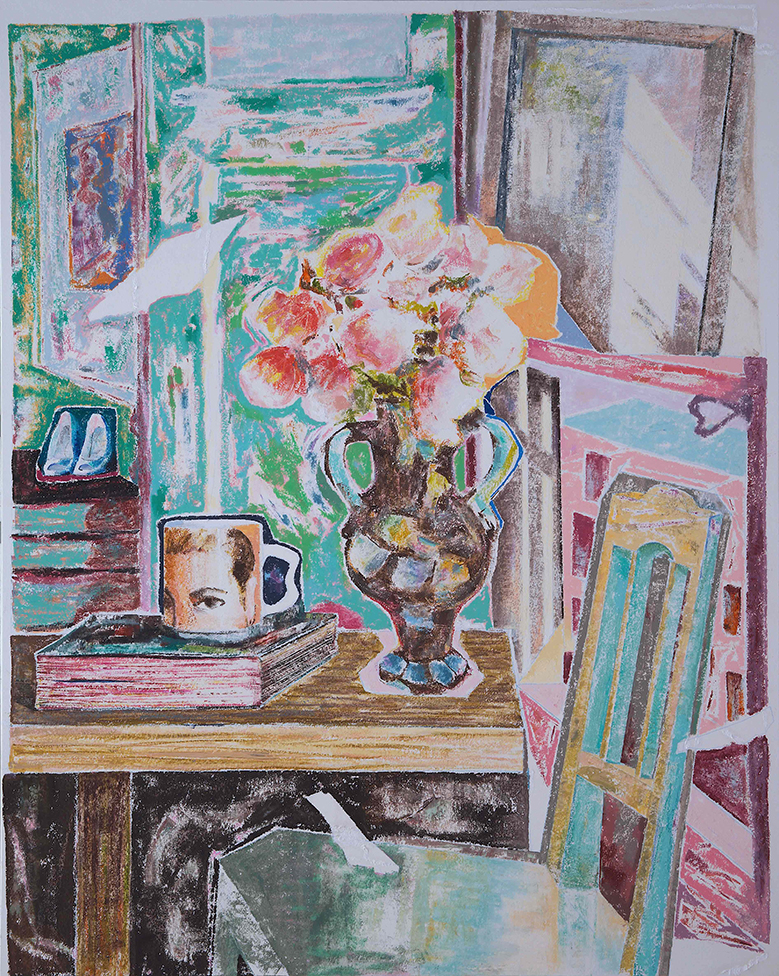 This piece, "Wednesday Morning," was inspired by my wife's weekly Ikenobo flower arrangement class on Tuesday evenings. The next morning, she would always find fresh flowers adorning our home and studio. Therefore, I attempted to recreate my feelings about seeing flowers in the morning through collage, hoping to imbue the otherwise realistic space with a more imaginative charm.