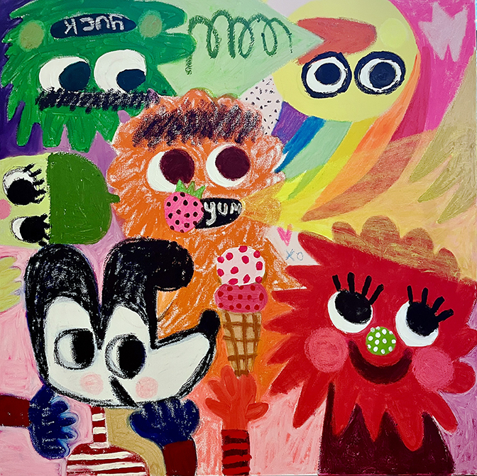 The painting was originally conceived as part of a larger, cohesive project titled “Yuck,” which introduces a new character and tone in artist's practice. The idea plays with things that are typically considered yummy becoming yucky through the eyes of a grump — touching on sensitivity, taste, and how feelings shift as children grow up and explore new experiences.