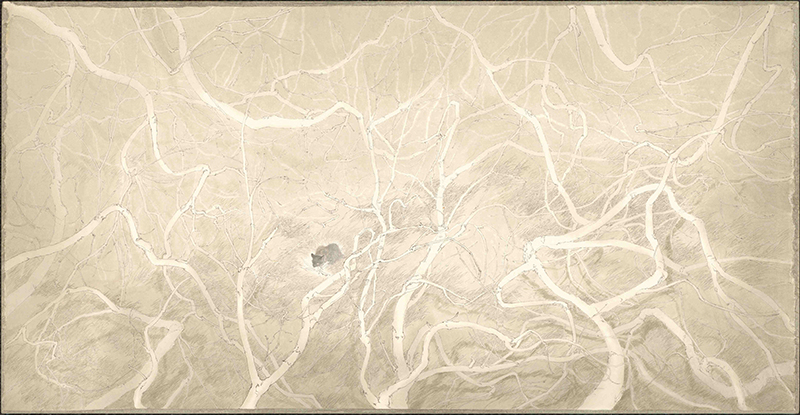 I depict the moment of encountering a black cat in the midst of hunting from an overhead perspective. The branches occupy the extreme foreground, looping backward into space, while the true protagonist does not emerge until the farthest depth of the scene. The viewer’s gaze follows the branches and the grass rendered in fine ink lines, gradually converging toward the center, where the image of a “large rat” slowly resolves into that of a black cat.