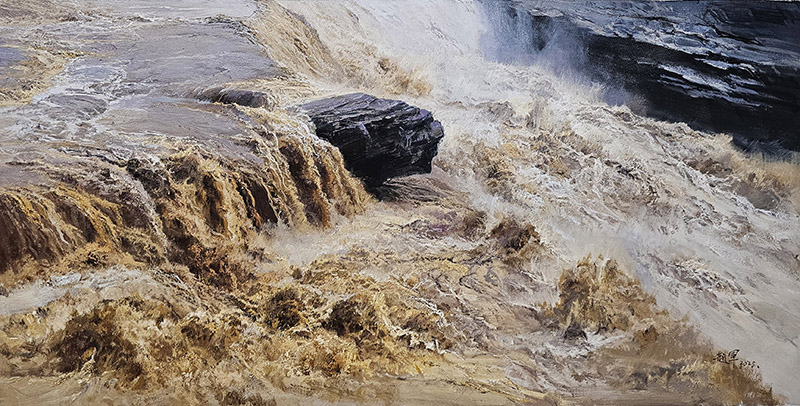 In the "Yellow River Hymn" series, the artist chooses the purest ochre as the soul of the painting - this not only the color of the Yellow River, but also the breath and pulse of the land that has been accumulating for a thousand years. The painting uses direct painting method, so every stroke is full of the present emotion and power: ochre is interwoven and superimposed repeatedly on the canvas, and is piled up and covered in thick places, rich texture. The brush moves on the canvas, which pursues the sense of breathing of the brushstroke: there is the magnificent charm of the painting; and there is the subtle exquisite dot dyeing, capturing the light and color of the flowing water. This work is the artist's most simple tribute to the mother river. It does not pursue flashy, but with the most sincere painting language, let the color grow naturally on the canvas, and let the soul of the Yellow River awaken in the purity of ochre - that the lullaby of civilization, the memory of the earth, and the hometown that never fades in the depths of the blood of every Shanxi child.