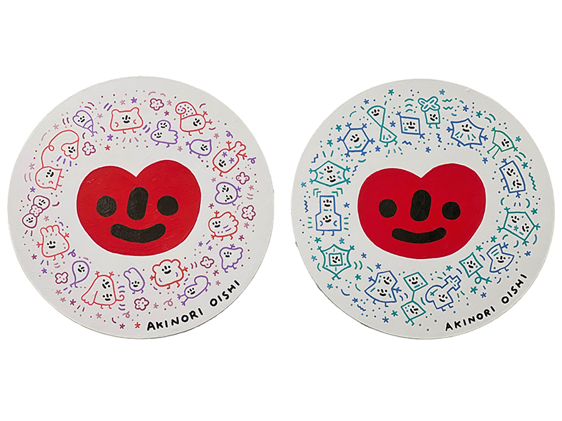 In Love in Embrace, OISHI places a red heart with a smiling face at the center of the composition—like a lamp that never dazzles, yet continues to glow—holding the purest source of feeling. Around it, handdrawn characters and symbols are densely woven, as if moving along the same invisible melody: holding hands, dancing, greeting one another, and offering encouragement. Here, “love” is no longer an abstract slogan, but a living state of interaction the eye can follow. The circular composition forms a ring—at once shelter and cycle—suggesting protection and return: love is answered and cared for in everyday life, deepening through repetition and enduring through flow. The differences between individuals, so present in our time, are gently preserved: some figures are rounded and soft, like clouds and bubbles, while others appear as angular squares, stars, and diamonds.