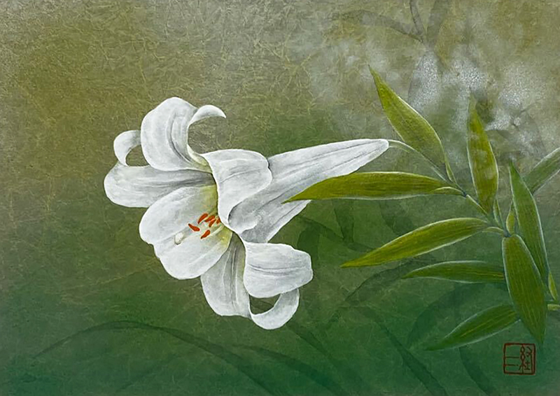 This work centers on a blooming white lily, rendered with delicately layered mineral pigments that create a soft, restrained luminosity. The flowing yet disciplined lines of the petals reflect the artist’s deep sensitivity to the rhythm of life in nature. A low-saturation green background establishes a tranquil atmosphere, allowing the lily to appear as if it is slowly unfolding in time. Beyond depicting floral beauty, the work serves as a metaphor for purity and inner resilience, embodying the artist’s approach of transforming natural observation into a spiritual landscape.