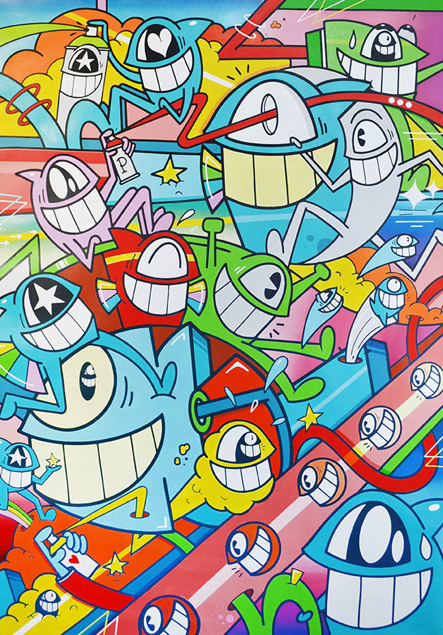The character of the Fish comes from experimentation and the desire to do something constructive on the walls of his city. The smiling fish is present in all his works, full of color and positivity — a joyful journey that goes from classic graffiti to experimental pop art.