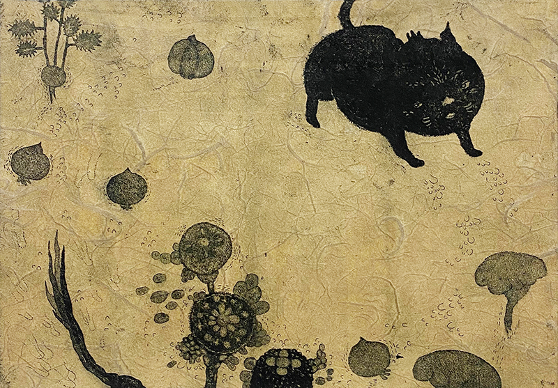 《A Cat in Plants》是一件靜謐而溫柔的銅蝕版畫作品。畫面中,黑貓安靜地佇立於植物之間,彷彿與周圍的自然氣息融為一體。細膩的線條與層層堆疊的肌理,營造出一種低聲細語般的節奏,讓觀看者不自覺放慢呼吸,進入作品所構築的感知世界。