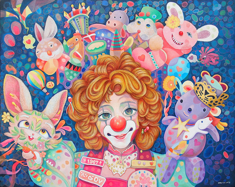 《歡樂幻想曲》是一首以童心為主題的視覺樂章。畫面中央的小丑人物以溫柔而略帶憂鬱的眼神凝視觀者,象徵成人世界中仍然保有的純真與柔軟內在。紅色圓鼻與誇飾妝容既是歡笑的符號,也暗示角色在喜悅與感傷之間的微妙平衡。