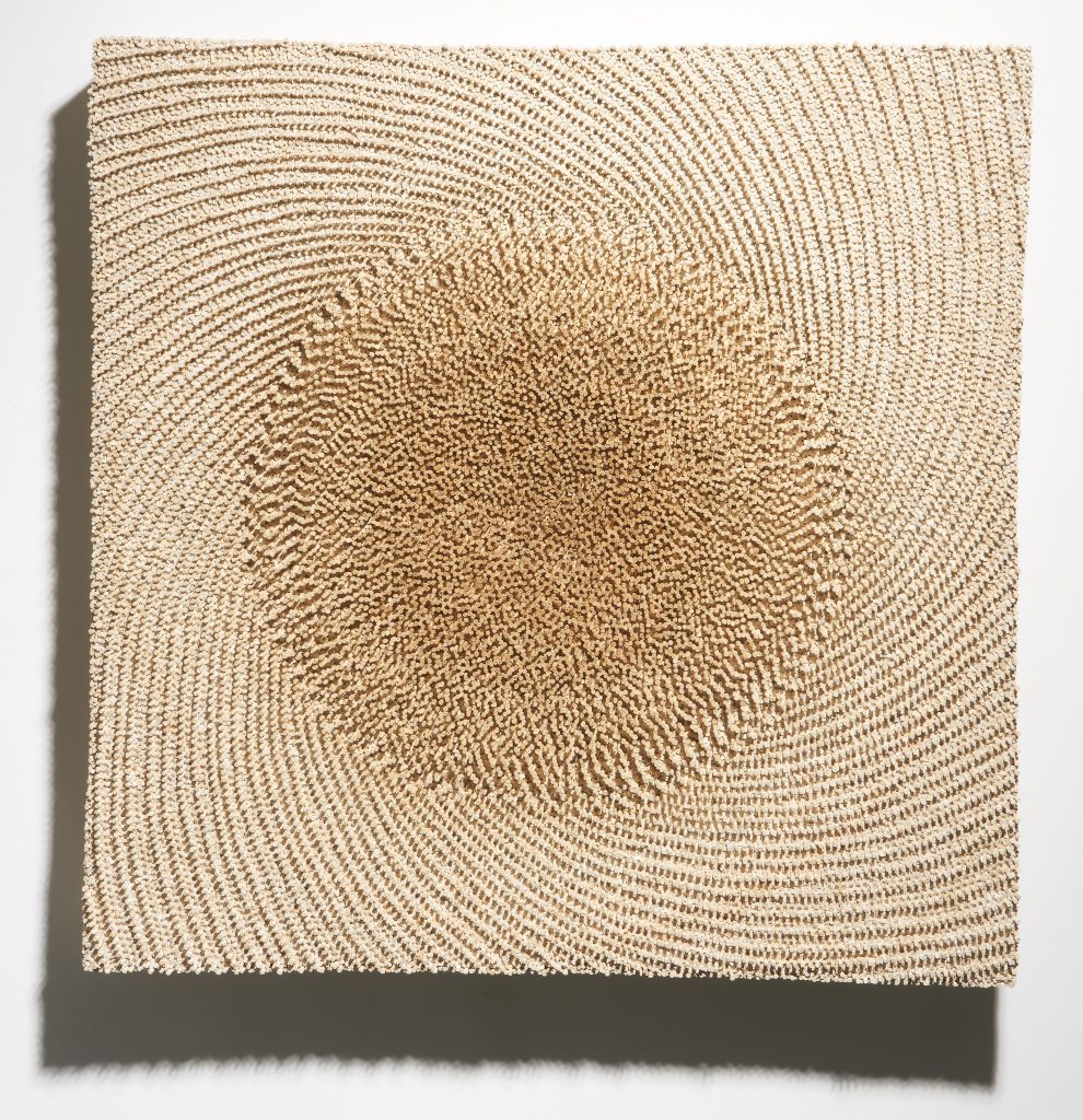 各类书籍在郑斗和手中重生,文字消散,纸张回归木浆的本质,经过繁复且漫长的工序——卷成圆形、均匀切割、如育苗般种植成图案——构建了“时间”,并通过完成的作品,将间接语言转换为直接交流。