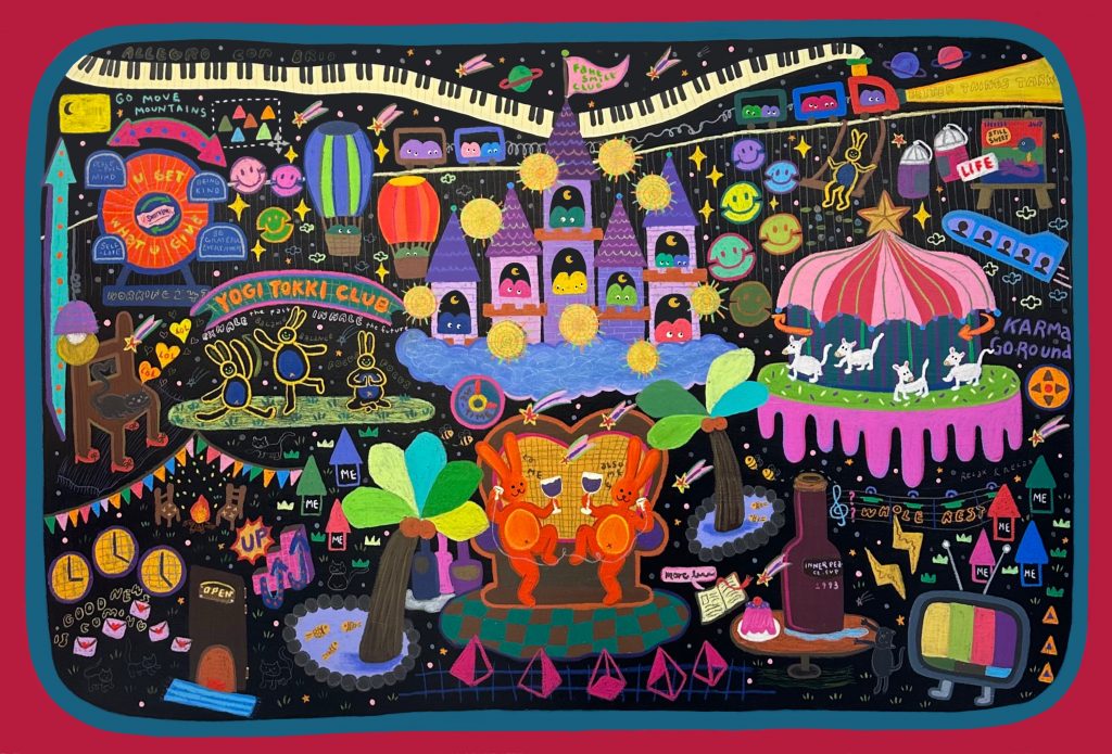 這件作品描繪的是所有電視節目結束後,月亮慷慨地將光芒灑落在寂靜夜晚的時刻。它捕捉了我面對真實自我、尋得內心平靜的安靜而溫暖的夜晚片刻。 作為《Inner Peace, s’il vous plaît》系列的變奏之一,這件作品透過摩天輪、旋轉木馬與雲霄飛車等遊樂園意象,象徵來自最平靜心境的最大喜悅;同時也隱含因果循環之意——每一段旅程終將回到起點。 畫面中陡峭而尖銳的屋頂如同向上的箭頭,表達了既想停留又想向上的複雜心情。圍坐在營火旁,靜靜凝望,手中捧著溫熱的茶與喜愛的書,我擁抱一種不由旋律或節奏構成,而是由休止與停頓編織出的平靜。這種寧靜氛圍象徵著休憩的停頓,以及邁向下一步前的心靈準備。