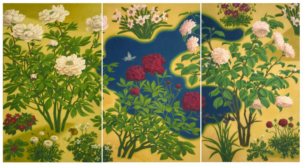 在林麗玲的創作中,花朵從不僅僅是自然的象徵,更是人性、慾望與精神狀態的隱喻場域。〈麗春花〉作為一幅三聯畫作,展現她持續對「花卉作為感性通道」的探究。盛開的白牡丹與赤紅花卉錯落其間,如浮游於金黃背景與深藍留白的交錯之中,不僅構築出層次豐富的視覺空間,也營造出一種幽微而含蓄的情感張力。