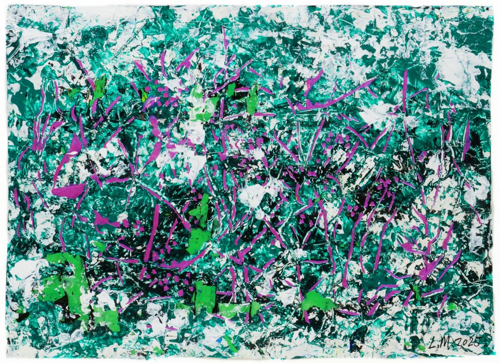 林墨常說,他作畫的目標並非追隨意識流任性揮灑,而是設法跳脫意識,進入一種無意識的純粹狀態,潛藏心靈深處的形象與情緒得以自由飛散,最終凝聚於畫布。正因如此,他的作品往往色彩斑斕、層次錯落,深沉與輕盈的色調彼此滲透,時而以鮮亮色塗抹基底,再以低彩度顏料覆疊;時而在柔和色調之間,悄悄埋入一抹幽暗,底層暗色像被覆蓋得若隱若現,以此製造光影的呼吸感,並將平面維度營造出更具層次的縱深。