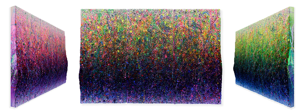 远看庄红艺的作品,像是从空中俯瞰一座盛放的花园,作品以三维立体呈现,细节却因距离而逐渐瓦解,交融变换的平面色彩强烈冲击着视觉感官。在创作中,庄红艺弱化了作品的边界感,使得观众如置身于花园,而观众的介入,也令其作品内容在展厅中得以“无限延伸”。