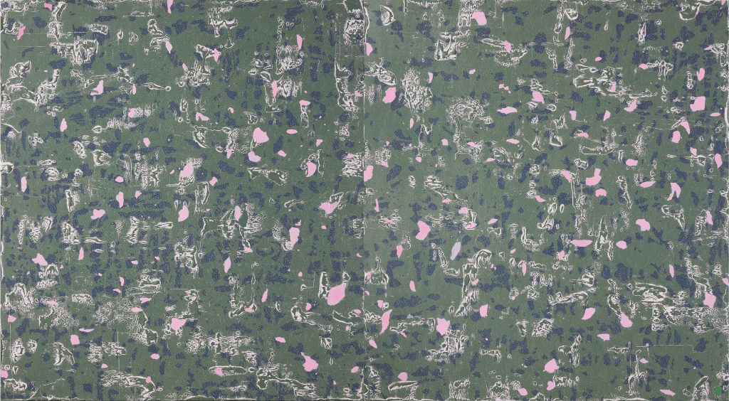 花雨紛紛,花語粉粉 時間的點覆蓋了冬天的影子 粉粉的花語跟著風 傳來春天的呢喃 傅作新的創作常透過圖層式的繪畫語彙與節奏性的筆觸,探索觀看與記憶之間的模糊邊界。《花語粉粉》延續其對「時間痕跡」與「感知層疊」的關注,透過綠色的肌理基底鋪陳空間感,搭配不規則的粉色斑點與白銀筆觸,營造出類似聲音殘響般的視覺律動。這些畫面中看似輕盈的粉色,實則承載著記憶與情感的濃度,如同春天初綻時無聲的呢喃,也如感官中最細微的悸動。作品邀請觀者進入一種「似曾相識」的凝視狀態,在抽象的肌理間尋找個人記憶的投射與共鳴。