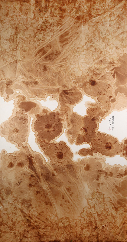 許悔之的「茶染系列」作品,是他多年以來對茶湯作為創作媒材的深刻實驗與內在回應。以茶代墨,他跳脫傳統水墨筆觸的線條敘事,轉而以染的方式,讓茶湯在紙上自然擴散、滲透、形塑,形成如波光微動般的抽象意象。茶染原料來自生物性的茶葉,色澤隨時間演變,作品本身便蘊含著歲月的痕跡與轉化的可能。這種創作方法也回應他少年時抄寫佛典的經驗,成為一種精神性的內觀實踐。