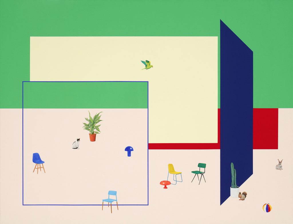 Bomin Kim以存在主義為核心,透過繪畫探討自我與他者、個體與世界之間的關係。她將都市空間簡化為幾何形狀,並以微小比例描繪人物背影,視覺化現代人孤獨的存在。這些人物彷彿喚起賈克梅第(Giacometti)雕塑中的步行者意象,以行走與凝視象徵「存在」本身。藝術家運用色面與形式表達記憶與情感,作品題目如詩句般引導觀者思考與想像。近期,她嘗試去除人物,專注於抽象空間的描繪,以純粹的色彩表現不安與孤獨的存在狀態。