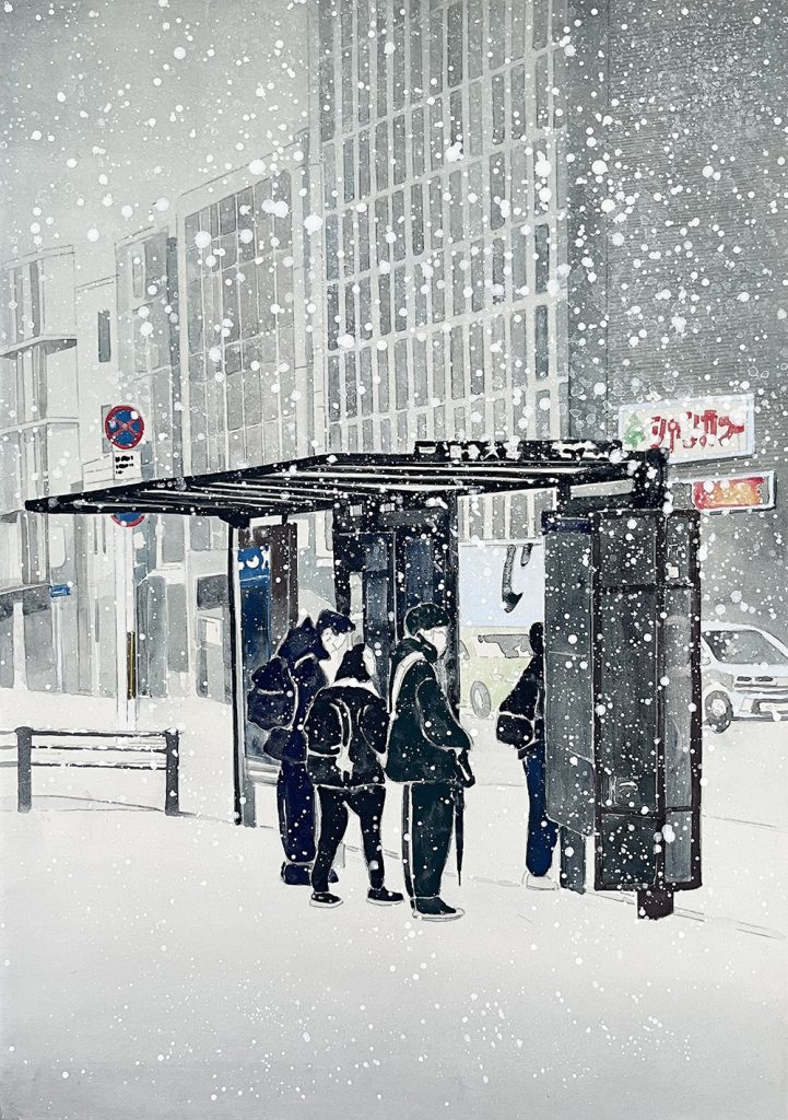 在其他畫作中,景象多呈現出冷靜、平面的構圖。無論是晴空下的街道,還是沉靜的住宅區,都瀰漫著一股幽微的空氣感。這種冷冽的氛圍,如同記憶中深刻的印記,成為作品中不可或缺的元素。透過不同的色調、光影與空氣感,她捕捉了生活中的寂靜與內斂,試圖將那段被孤獨與記憶並行的生活,具象化地呈現在觀者面前。這不僅是對生活的再現,更是對自身內在情感與記憶裂縫的沉澱與梳理。