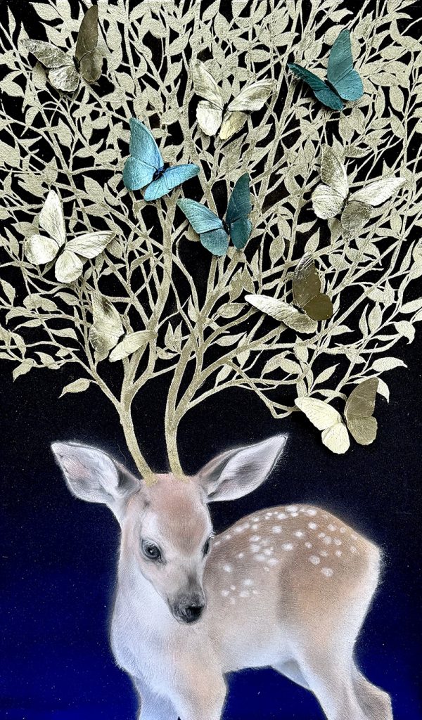 佇立於夢幻森林中的鹿,宛如光的化身,也是純真無垢之心的象徵。我所描繪的,是樹木、動物、光與影,一切萬物皆和諧共存、寧靜而美麗的世界。