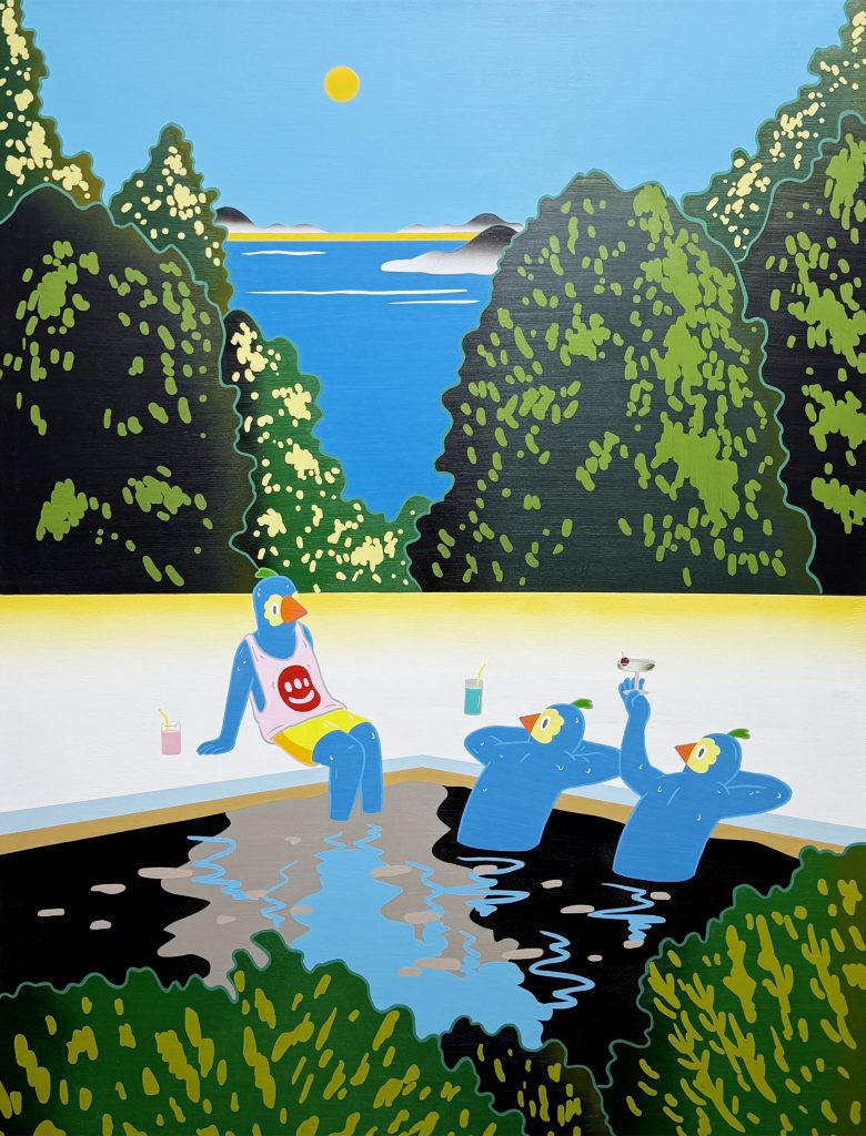 在《下午,泳池邊》這件作品中,三位鸚鵡人悠閒地待在泳池裡,背景是一片翠綠林蔭與閃閃發光的海面,夕陽正懸掛在遠方的水平線上。他們聊天、泡水、舉杯,彷彿在完美複製人類午後的放鬆時刻。
