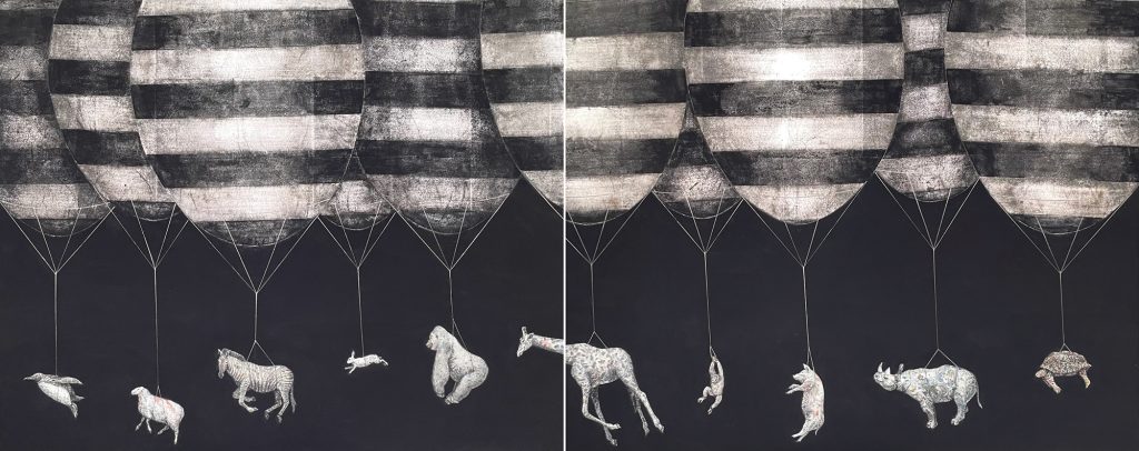 白田誉主也於1984年日本茨城縣出生,現居台灣台中,2012年取得筑波大學人間綜合科學研究科藝術博士學位。專研膠彩繪畫的白田誉主也在致密嚴謹的膠彩技法基礎下結合日本和紙、寒冷紗、金/銀/洋箔等表現材料建構出優美細膩的視覺效果,在最新創作中可見動物們充滿活力的進行擬人化的文化行為,畫中每個角色都有專屬於自己的紋理,象徵「平安」、「幸福」、「繁榮」等美好意涵,亦賦予動物們靈動優雅形象,帶出具詩意的浪漫情懷,傳達萬物在世上皆有其獨特的存在意義及價值。藝術家筆下的動物們非純粹的個體創造,而是開闢出屬於自己的世界觀,每個畫面鋪成都幻化成一篇篇活潑生動的故事情境,白田誉主也在自述中曾提到「我們觀看眼前作品時,會有許多交流,如理解、意讀、猜測等,而在面對動物時,因為語言上的不同,即便透過觀察與揣測,還是有我們無法意會的地方,是我覺得有趣及具魅力的地方。」,其作品迷人的神秘特質吸引著海內外藝術愛好者及藝術機構關注,展覽遍及歐亞地區,包括德國、日本、新加坡等國,並受邀至多間美術館舉辦個展。